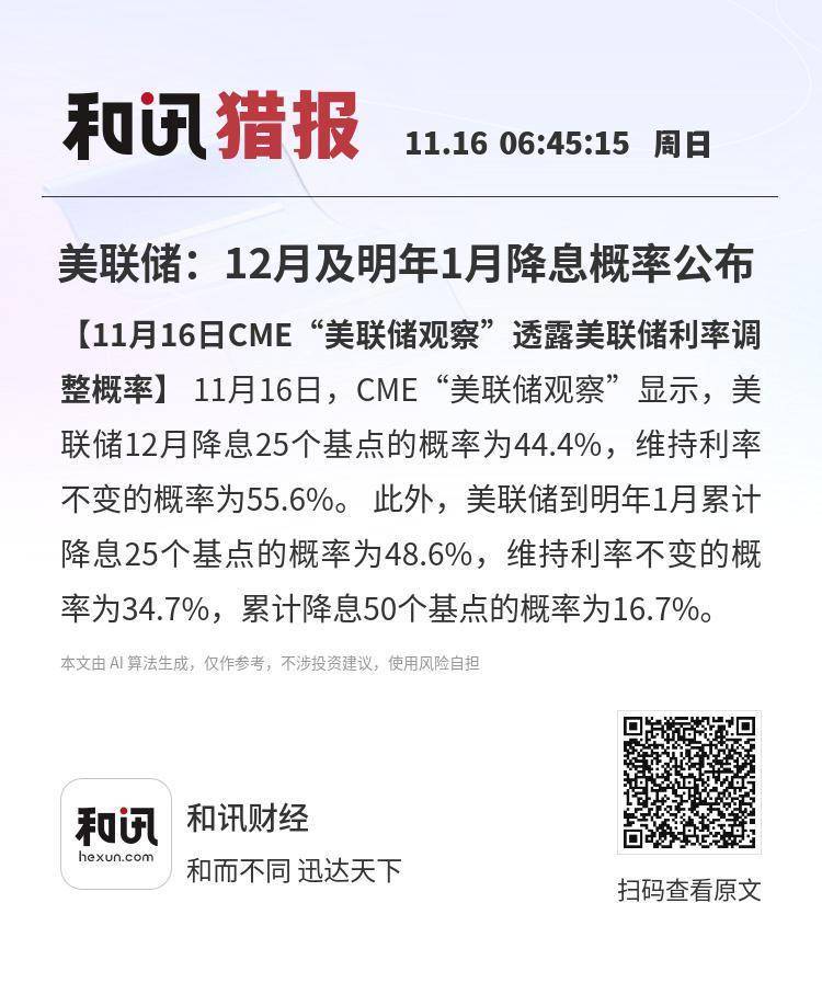 【11月16日CME“美联储观察”透露美联储利率调整概率】11月16日,CME“美联储观察”显示,美联储12月降息25个基点的概率为44.4%,维持利率不变的概率为55.6%。此外金控配资·,美联储到明年1月累计降息25个基点的概率为48.6%,维持利率不变的概率为34.7%,累计降息50个基点的概率为16.7%。