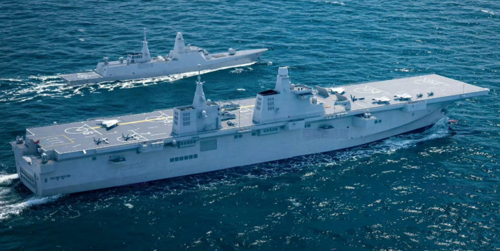 有航母压阵扛下高强度战争,两栖舰只需要负责低强度冲突、撤侨、前沿威慑这些“杂活”。
