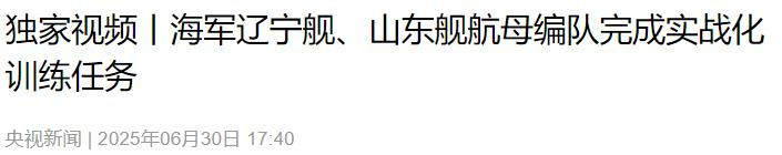 2.央视新闻:《独家视频丨海军辽宁舰、山东舰航母编队完成实战化训练任务》2025-06-30